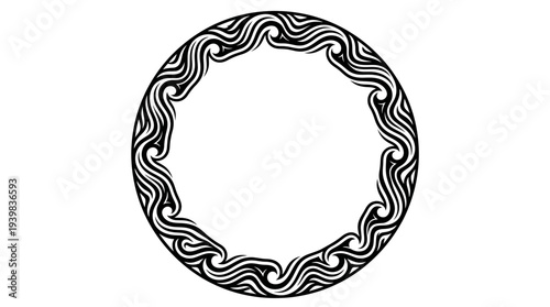 Black and white circular frame with wavy pattern on white background.