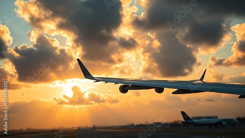 velocity. Commercial jet ascending through cloudy golden hour sky, wing visible, dramatic sunlight shadows. mobility guides, transit brochures, designed for transport & logistics marketing.