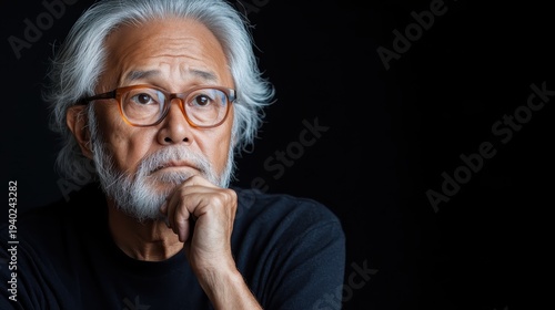 A close-up of a contemplative older man resting his chin on his hand, portraying wisdom and deep thought, set against a dark background that enhances his reflective nature.