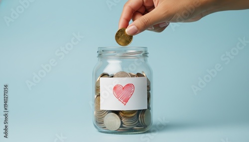 charity, donation, savings, heart, coins, money, support concept of philanthropic giving and financial support for social causes using a glass jar and hand-drawn heart label on a blue background.