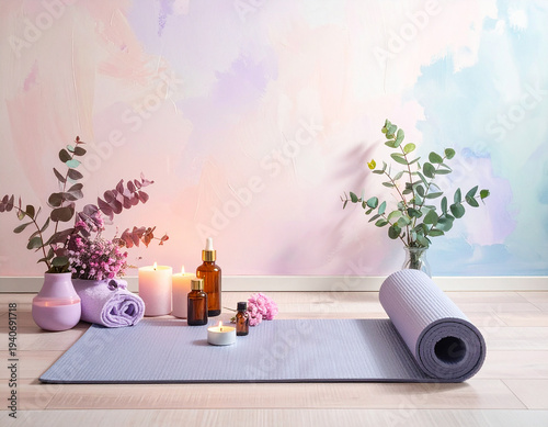 Serene yoga mat with essential oils and candles for a peaceful home wellness sanctuary