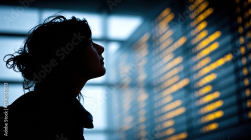 Business Traveler Looks at Departure Board While Waiting for Flight Information in Airport