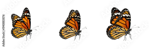 Monarch butterfly set, orange Danaus plexippus collection for nature and garden design, flying insect wildlife specimens, isolated on white background, PNG cutout