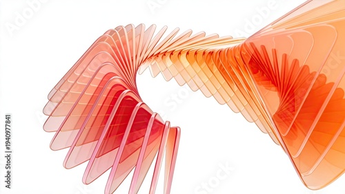 Abstract 3d rendering of flowing orange and red translucent glass layers creating a dynamic spiral shape isolated on white background for modern design technology and creative concepts