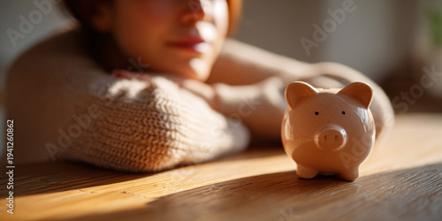 Woman contemplating savings with piggy bank on wooden table, concept of financial planning and future security