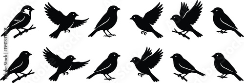 Flat vector illustration of bird silhouettes, perched and flying poses, ornithology design, nature collection, wildlife outline, decorative black shapes