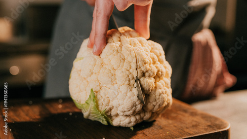 Hand gently holds fresh cauliflower on wooden cutting board. Soft focus background suggests kitchen setting. Warm lighting highlights vegetable texture. Ideal for cooking, healthy eating