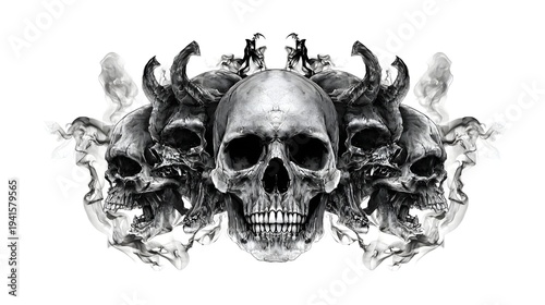Hyper dark fantasy tattoo design concept showcasing a detailed skull and bones central element encircled by multiple demonic visages and swirling smoke in stark black and white ink