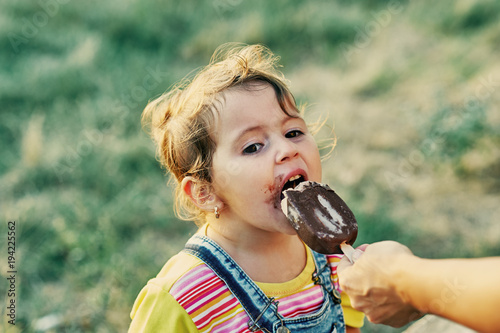 Funny little girl with ice cream . The girl was stained with a sweet dessert