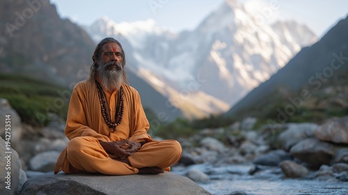 Hindu sadhu meditates in lotus position beside Himalayan mountain stream, orange robes contrast with snow-capped peaks, prayer beads and trident staff nearby, solitary spiritual seeker embodies