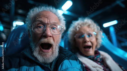 Two seniors exhibit pure joy and excitement as they experience a thrilling ride, highlighting the zest for life and joy found at any age in capturing cherished moments.