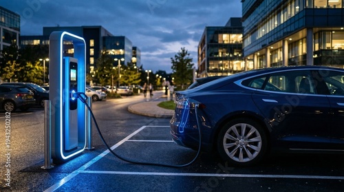 Borne de recharge électrique futuriste illuminée de bleu sur un parking d'entreprise de nuit, voiture électrique en charge devant un centre d'affaires moderne, concept de smart city et technologie.