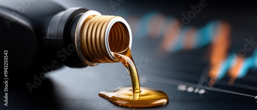 Close-up of oil dripping from a gas station spout with a background of a stock chart in blue and orange colors rendered in 3D style