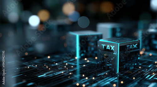Futuristic digital landscape with glowing tax blocks and intricate circuit patterns representing economy and fiscal policy, defocused background, digital taxation concept, with