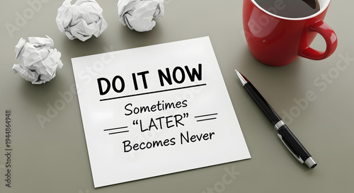 Do it now sometimes later becomes never motivational quote on a sticky note