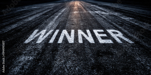 Winner asphalt track text painted on road with sunrise glow and dramatic perspective
