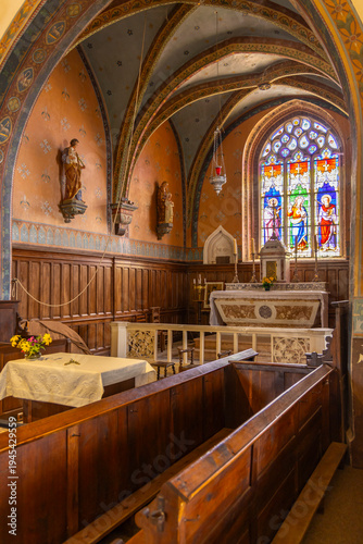 Ornate church interior featuring stained glass window and altar in Chateauneuf