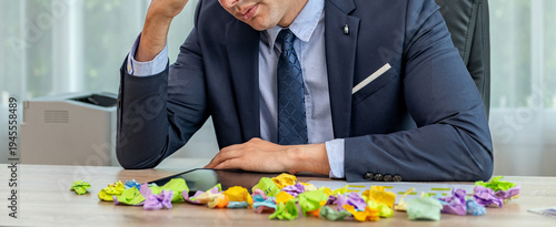 A businessman is sitting at his desk, his head in his hands. He is surrounded by crumpled paper. He looks stressed and tired.
