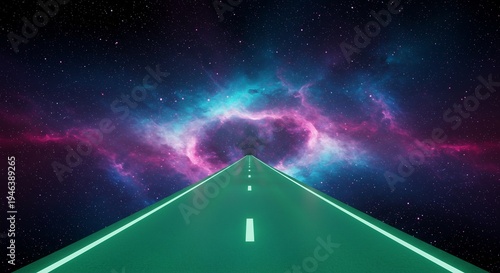 広大な宇宙空間を貫くように伸びる神秘的な緑の道が七色の光を放つ幻想的な星雲の中へと無限の旅路を誘い未来への壮大な冒険を力強く描きます. AI Generated