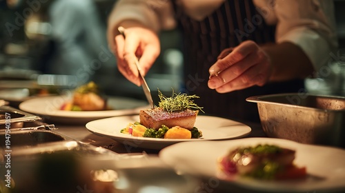 Chef preparing gourmet food plates professionally.