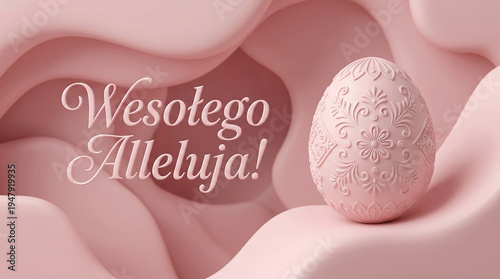 Różowa pisanka Wielkanocna z życzeniami wielkanocnymi na różowym falistym tle.