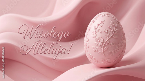 Różowa pisanka Wielkanocna z życzeniami wielkanocnymi na różowym falistym tle.