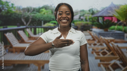 Woman covering her eye with hand and sometimes covering mouth on an outdoor lounge deck with sunbeds in building; uncertainty privacy.