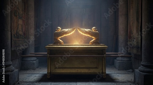 Golden Ark of the Covenant with two cherubims inside ancient stone temple. Biblical relic and holy artifact. Divine light radiating from lid. Historical mystery and religious symbol.