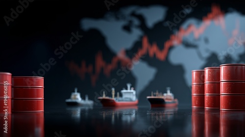 global oil price crisis concept, oil barrels, world map background, cargo ships, rising stock market chart symbolizing increasing oil prices, global economy and energy crisis theme, professional news