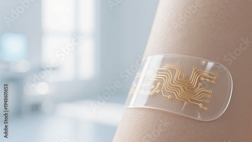 人の腕の皮膚に貼られた金色の電子回路が組み込まれた透明なスマートパッチのクローズアップ画像