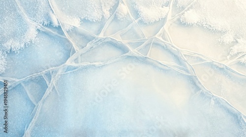 Close-up of fractured glacial ice with rough, snowy edges and translucent layers in soft blues and warm yellow light
