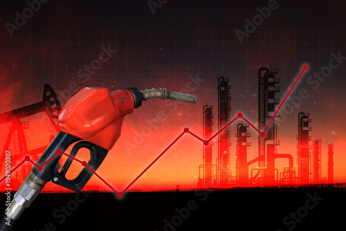 Concept image of rising oil prices showing a red fuel nozzle in the foreground with an upward trend graph and silhouettes of oil refinery and pumpjack in the background. Symbolizing global energy cris