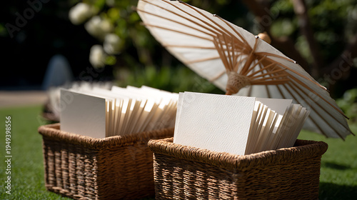 Elegant Wicker Baskets Hold Blank Programs and a White Paper Parasol on a Sunny Green Lawn, Ready for an Outdoor Ceremony