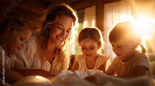 A heartwarming scene of a mother and her children enjoying quality time together in a cozy space, radiating warmth, love, and cherished moments of family life.
