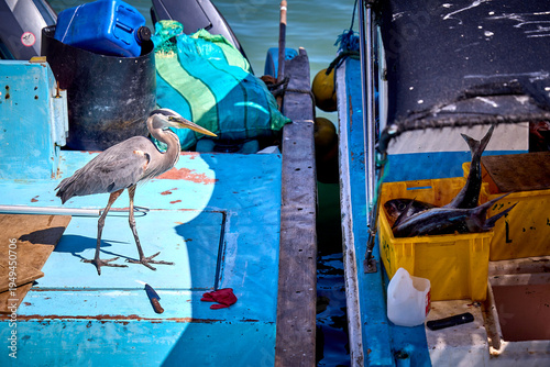 Ein Reiher hofft auf einen Fisch und wartet, bis im Fischer etwas gibt.