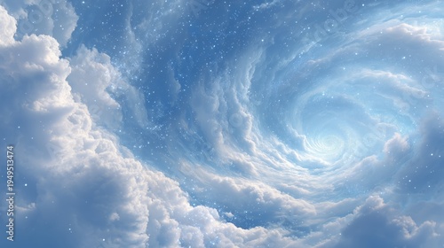ethereal spiral galaxy in blue sky with clouds and golden light