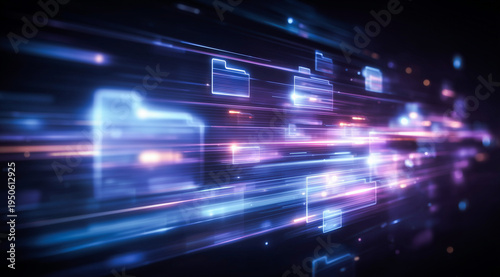 Flying digital translucent file folders and data streams in a dark blue environment representing cloud storage and information retrieval
