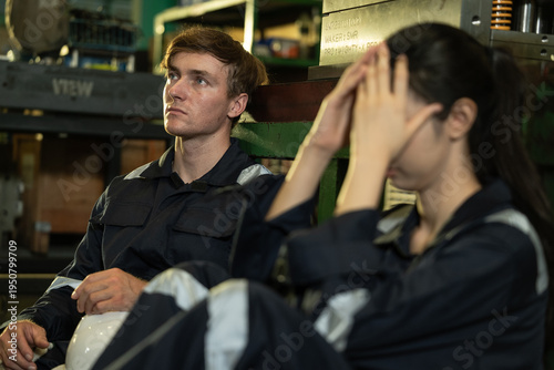 Stressed industrial workers sitting on a factory floor feeling exhausted and worried. Tired engineers in blue uniforms take a break after a long shift, showing burnout, fatigue, and manufacturing cris