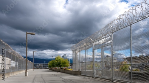 Urban skyline with prison fence under dramatic sky featuring clouds and barbed wire creating a stark contrast in the environment