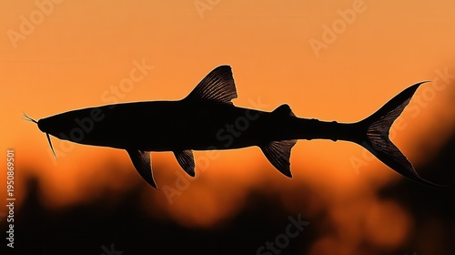Sylwetka drapieżnej ryby na tle intensywnego pomarańczowego nieba podczas zachodu słońca, ukazująca piękno podwodnego świata w złotej godzinie.