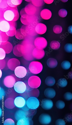 Pionowe ujęcie kolorowych świateł bokeh tworzących magiczną atmosferę z neonowym różem i niebieskimi akcentami na głębokim czarnym tle.