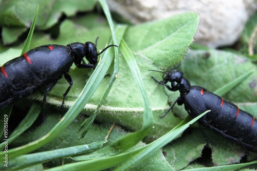 schwarz rote ölkäfer mit großem hinterleib am boden krabbelnd/käfer bei der nahrungsaufnahme, vor der paarung/giftige insekten in spanien, europa