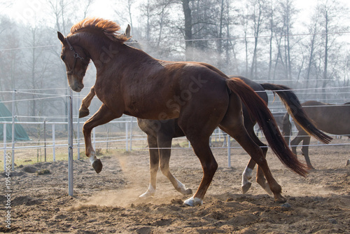 Młode dynamiczne konie na piaskowych wiosennych kwaterach