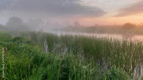 A tranquil landscape at sunrise or sunset features tall green grasses in the foreground, a calm body of water, and a thick layer of fog over distant trees. The sky is painted with soft pastel colors