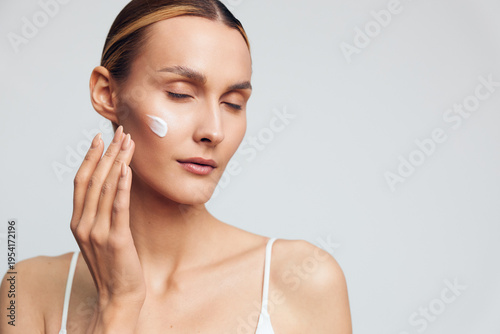 Woman with closed eyes applying white face cream on cheek. Skincare routine concept with natural light and neutral background. Focus on healthy skin and self-care.