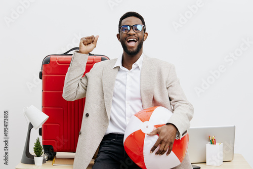 Smiling man with dark skin, sunglasses, and a beige blazer holding a beach ball and standing in front of travel accessories and suitcase, vacation, holiday, summer vibes, travel concept, joyful
