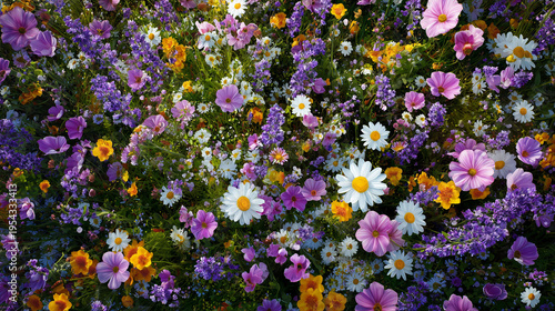 色鮮やかな野生の花々が咲き誇る草原の俯瞰