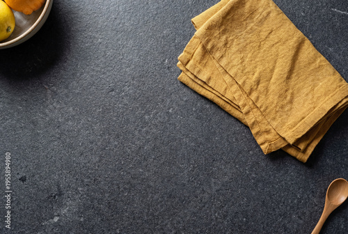 Dark grey textured stone kitchen table surface with folded yellow napkins