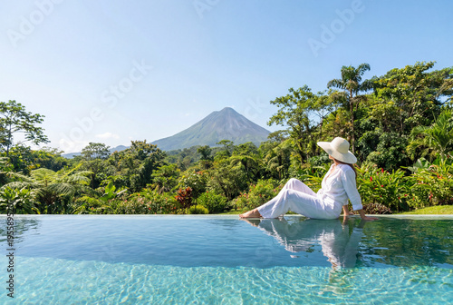 Woman relaxing in infinity pool looking at volcano view