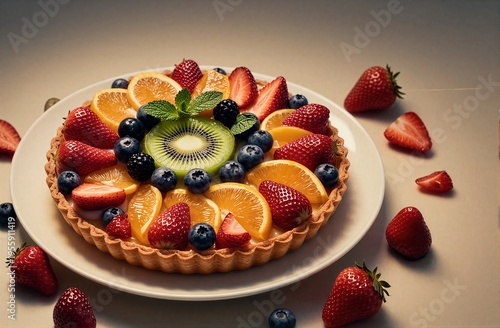 Colorful fruit tart with strawberries kiwi blueberries and orange